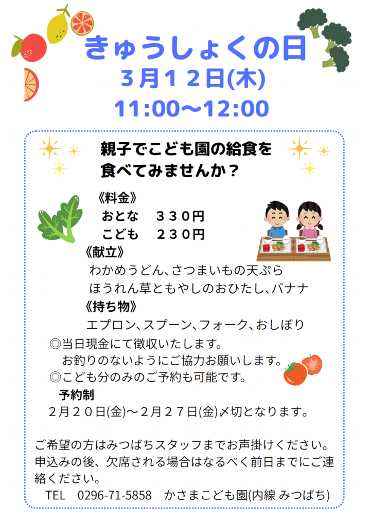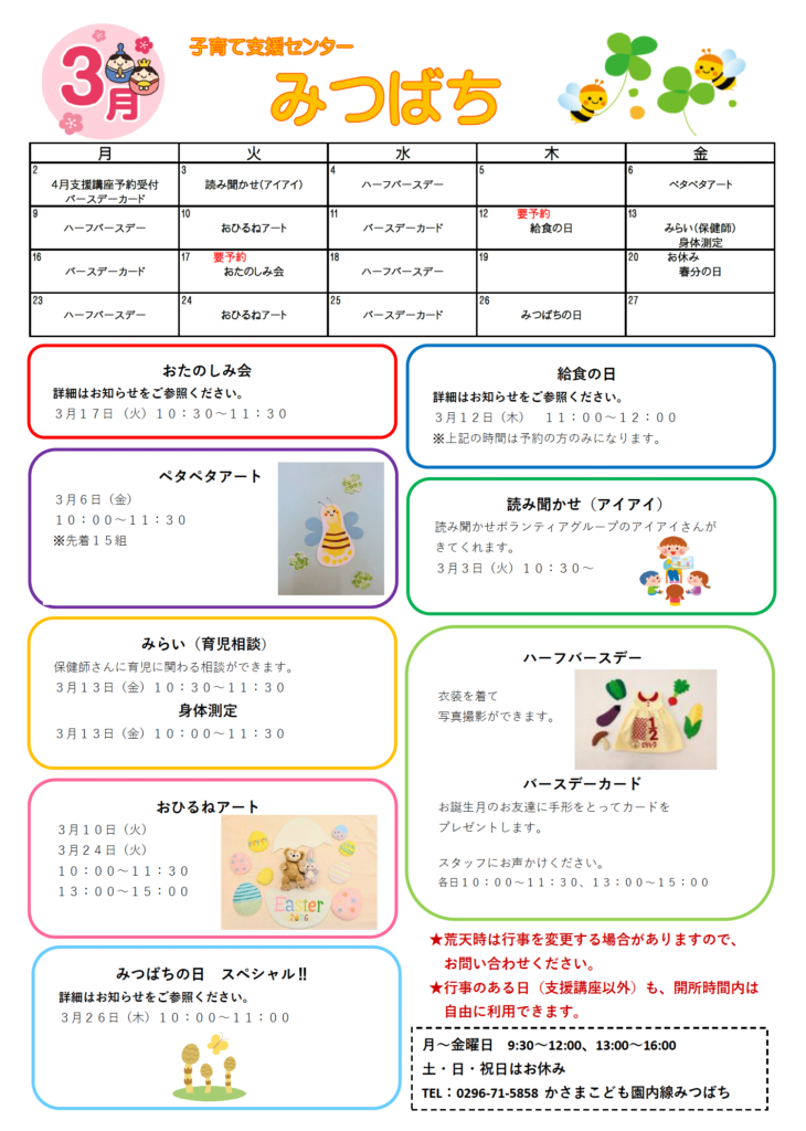 【みつばち】令和7年度3月の予定 2026 2/24 子育て支援センターみつばち 子育て支援センターみつばち URLをコピーしました! 鬼退治!豆まき会👹 雪が降ったよ⛄️❄️ コメント コメントする コメントをキャンセルコメント ※ 名前 ※ メール ※ サイト 次回のコメントで使用するためブラウザーに自分の名前、メールアドレス、サイトを保存する。 上に表示された文字を入力してください。 Δ