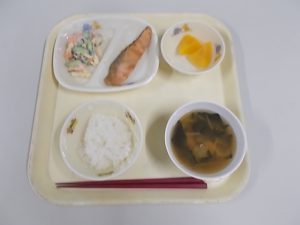 ごはん サケのみそ焼き マカロニサラダ 黄桃缶 みそ汁(こまつな・もやし・麩)。