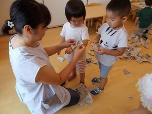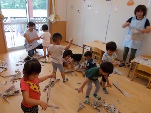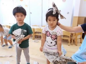 ビリビリ破いたり、丸めたり^ – ^ブレスレットやカチューシャも作ってみました^ – ^今日も元気なかさまっこたちでした☆