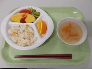 チキンピラフ チーズオムレツ グリーンサラダ オレンジ コンソメスープ。