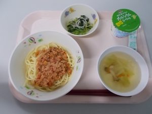 スパゲティミートソース 小松菜ともやしの和え物 ヨーグルト コンソメスープ(しめじ・キャベツ・ニンジン)。