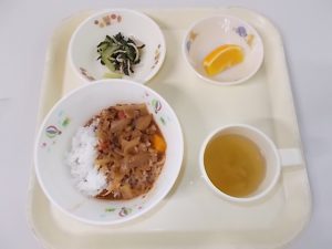 完熟トマトのハヤシライス チンゲン菜のソテー オレンジ コンソメスープ(絹さや・にんじん・えのき)。