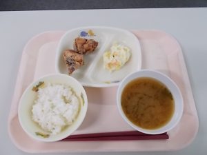 ごはん 鶏肉の竜田揚げ チーズポテトサラダ オレンジ 味噌汁(みつば・いんげん・豆腐)。