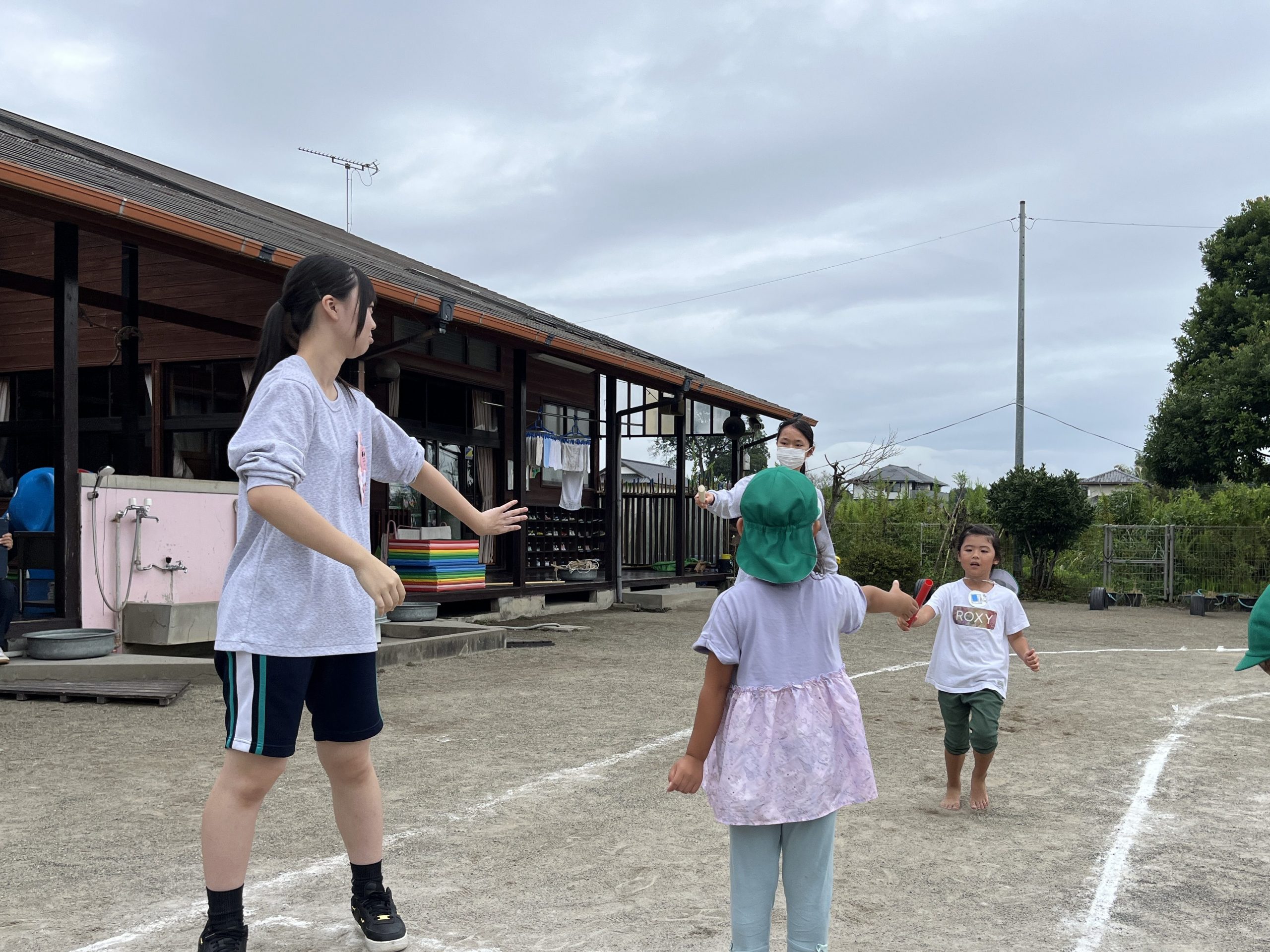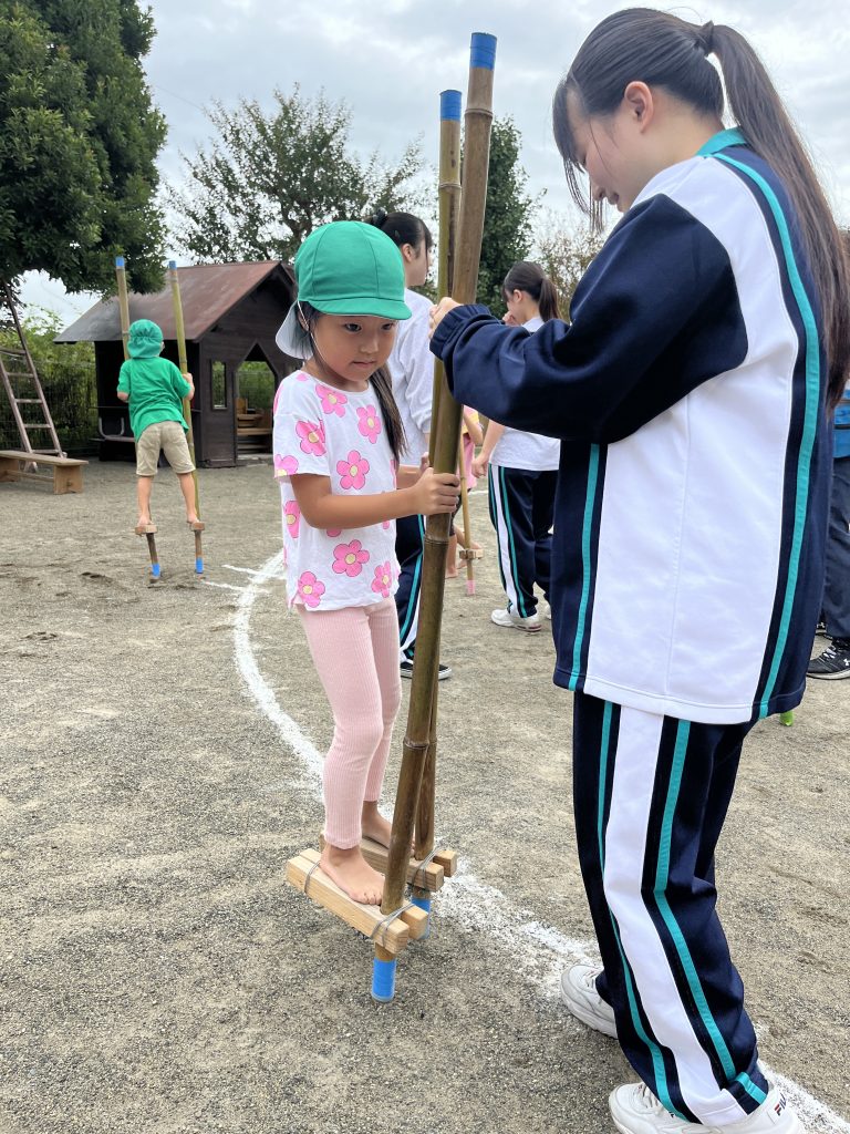 9月27日(金)に大成女子高校の生徒さんが遊びに来てくれました!午前中は、運動会の練習を見てもらった後に生徒さんVSにじ組でリレーをしたり、竹馬が乗れるようになった姿を見てもらいました!「リレー絶対負けない!」と、子どもも生徒も全力疾走!午後は、一緒にリズム遊びをしたり運動会に行うパフォーマンスを披露しました。「こんなこともできるんだね」とたくさんの拍手をもらって子どもたちの気持ちもさらに高まりました。