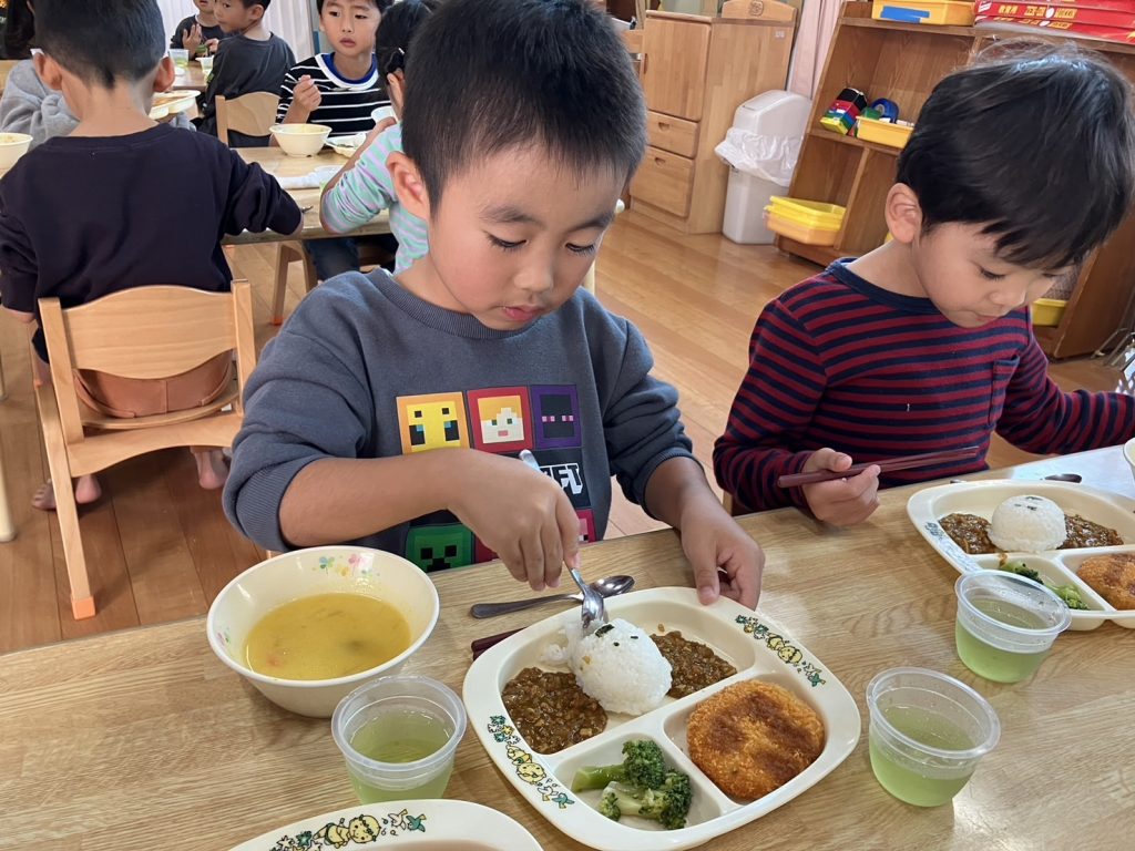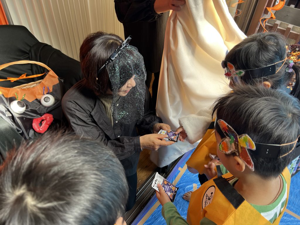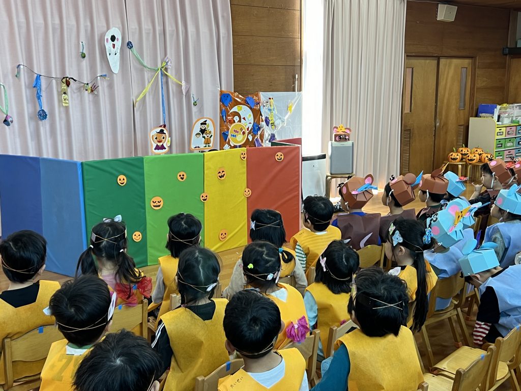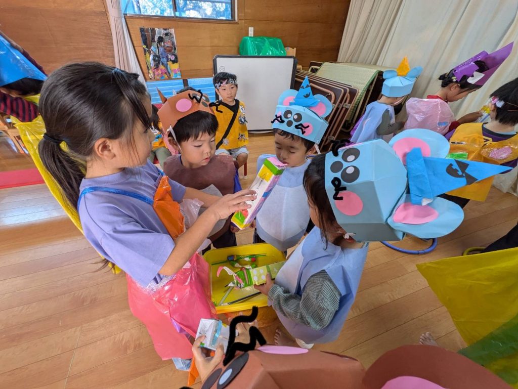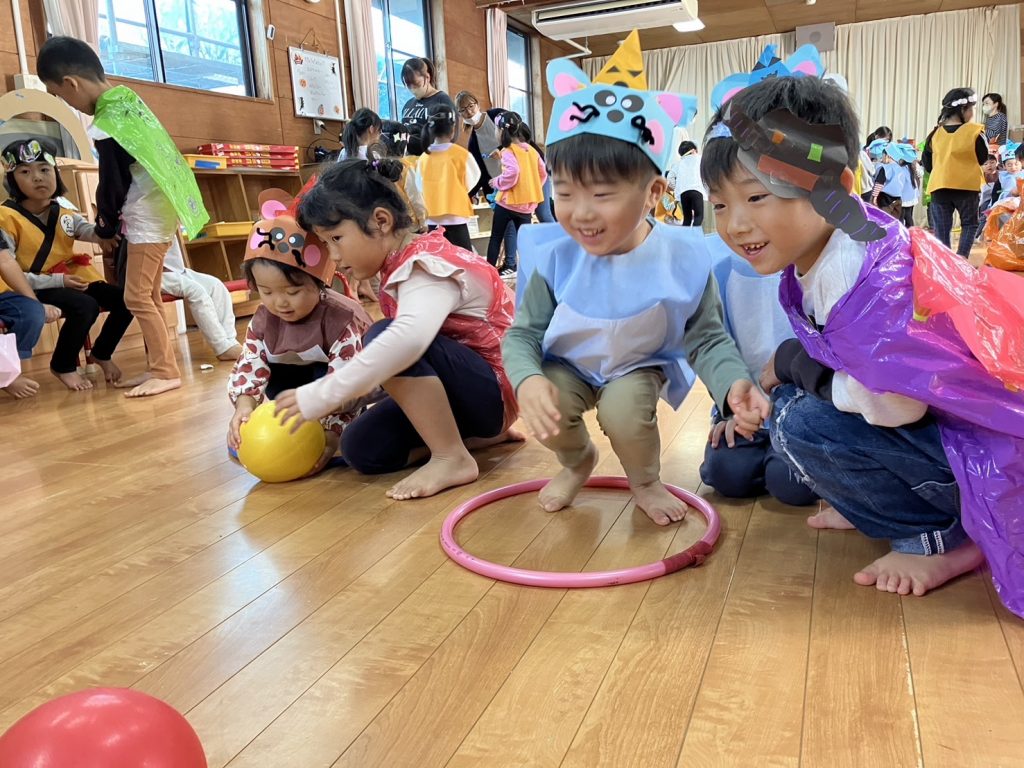 10月31日はハロウィン!今年は自分たちでハロウィンの衣装を作りました!ハロウィンの由来を教えてもらってから、事務所に行って魔法の言葉“トリックオアトリート”を唱えてお菓子をもらいました!その後はにじ組さんが作ってくれたゲームにご招待✨ おばけを倒す弓矢ゲームと桃太郎・金太郎のボーリングを教えてもらいながら一緒に挑戦しました。給食にはおばけカレーも食べて、ハロウィンの雰囲気を楽しみながら1日を過ごすことができました。