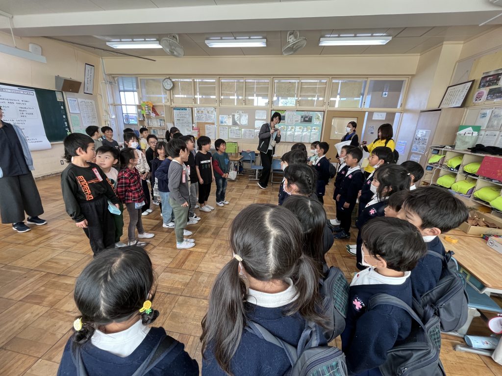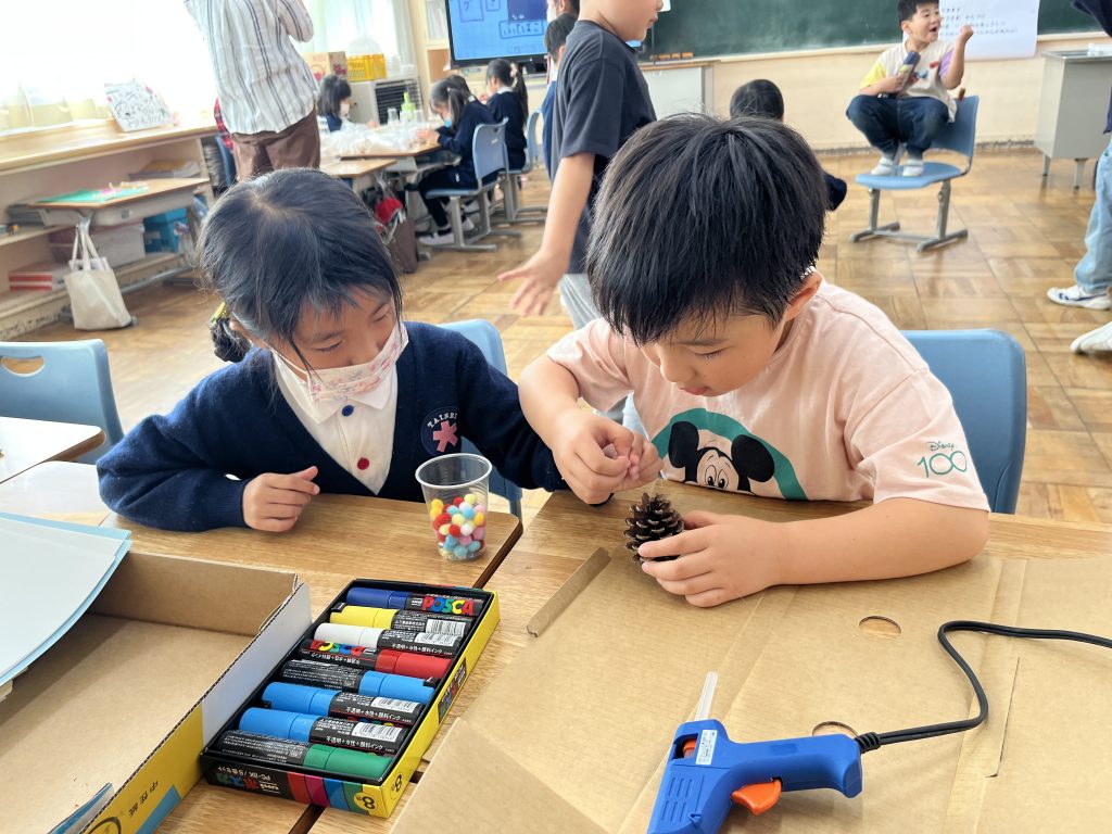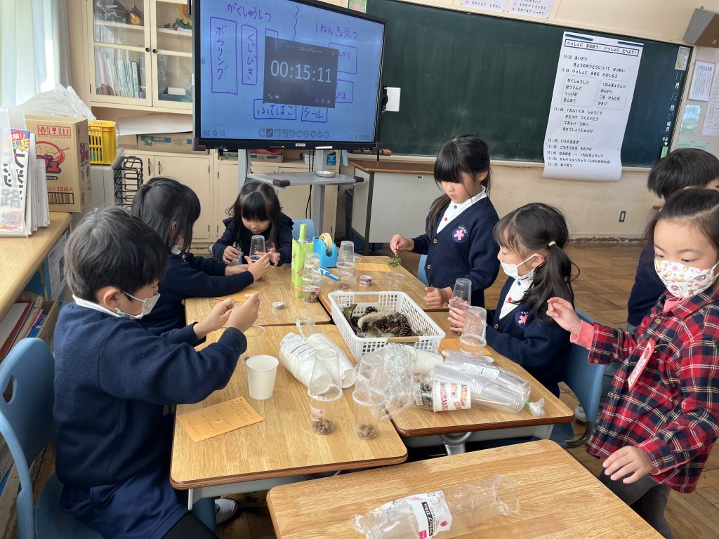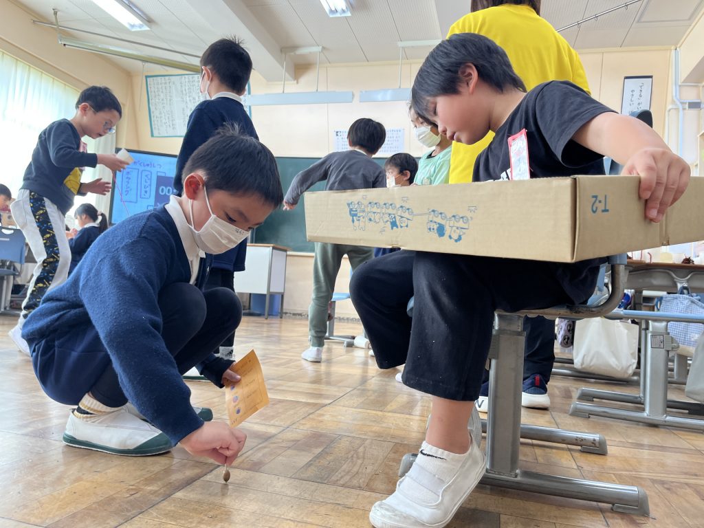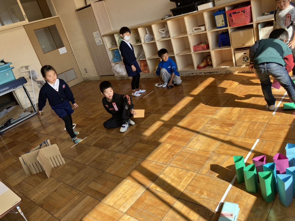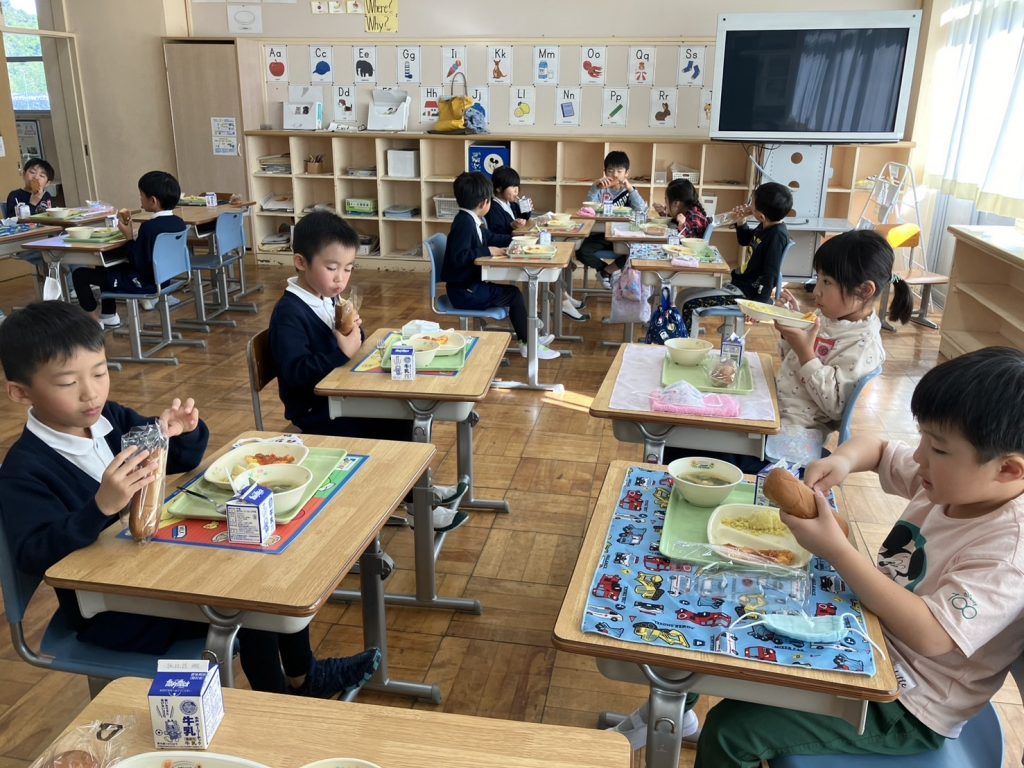 11月12日(火)に額田小学校へ行き、給食体験をさせていただきました。給食までの時間に、一年生が秋の自然物などで作った的当てやコマ、楽器作りなど様々な体験を用意してくれていて、年長さんも遊び方を教えてもらいながら夢中になって遊んでいました。小学生が配膳してくれる様子を見学しながら、一年生と一緒に食事を楽しむ子どもたち。