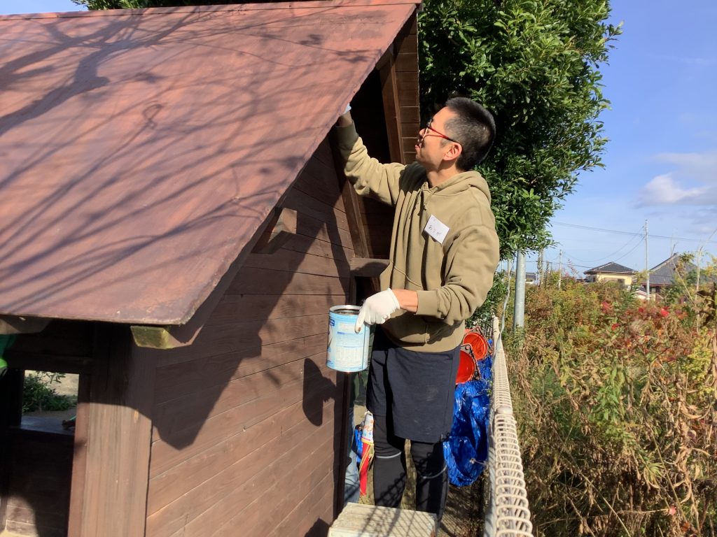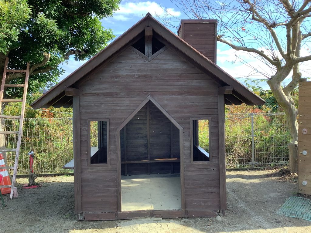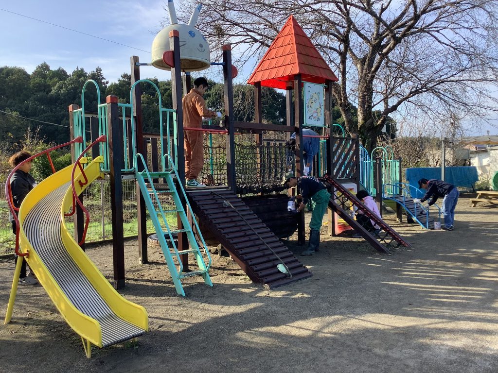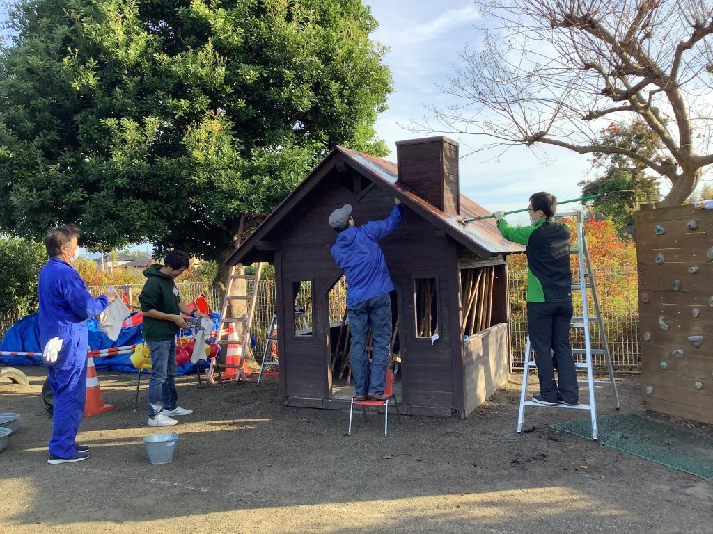 今年度最終回となる第4回目のおやじの会が11月16日に行われました。今回は10名のおやじの方が参加していただき、3回目が中止となって出来なかった総合遊具とログハウスのペンキ塗りをしていただきました。半分に分かれて分担しながら短い時間でとても奇麗な遊具になりました!