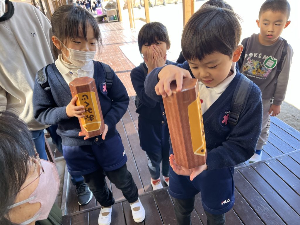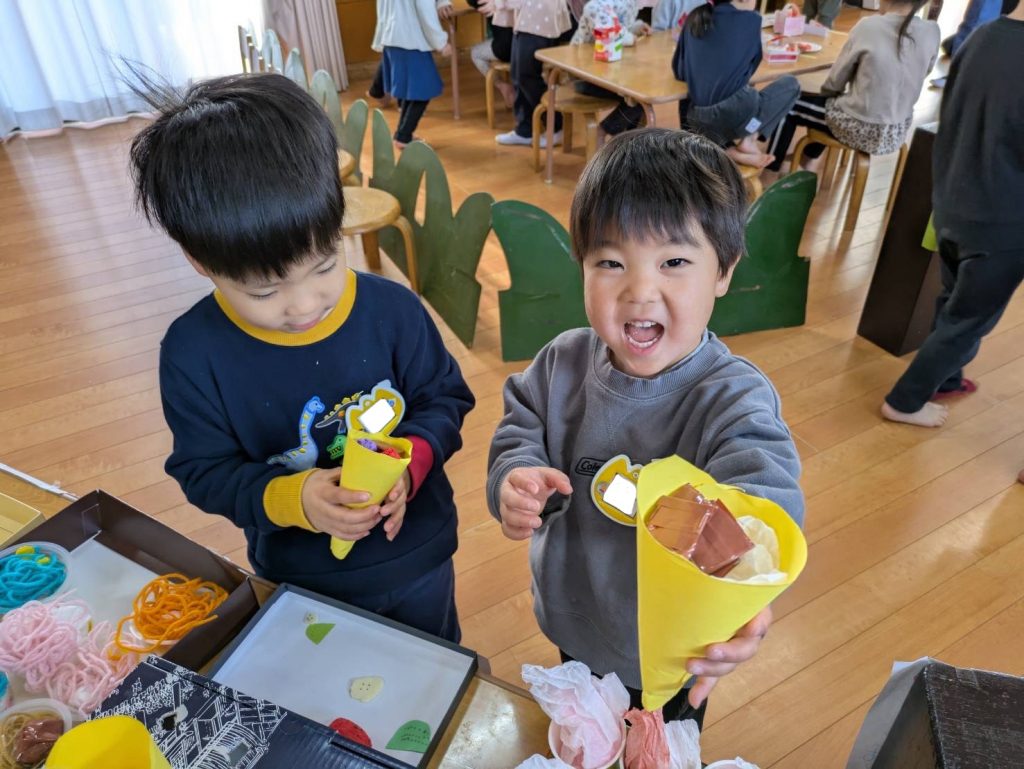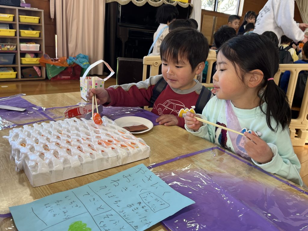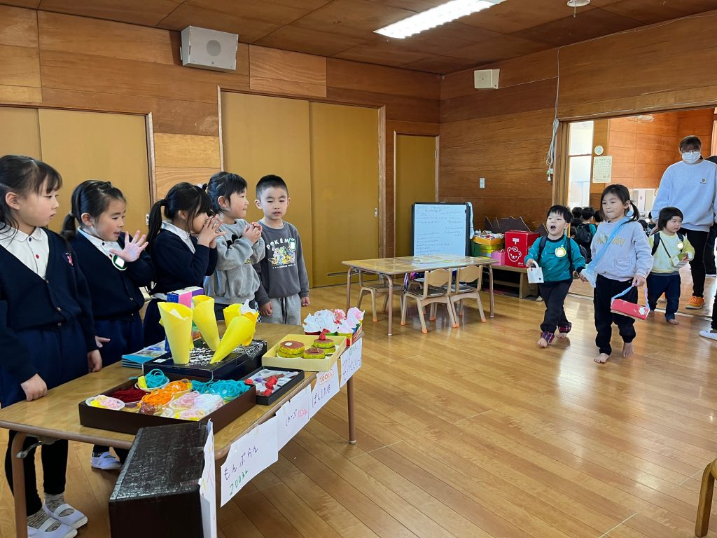 「こちらのメニューから選んでください。」「お肉は何枚食べますか?」などと店員さんになりきる年長さん!そら組さんはつき組さんを連れて、チケットやお金の使い方を教えながらお買い物へ!迷子にならないようにしっかりお世話をしてくれました。つき組さんもお兄さんお姉さんとの交流を深めながらお店屋さんを楽しむ姿が見られました。事務所でもお店がオープン!!くじ引きをして素敵なプレゼントをもらうことができました。また、当日はぬかっぽさんも参加してくださり、お母さんと一緒に食べたりとやりとりを楽しむ姿が見られました。