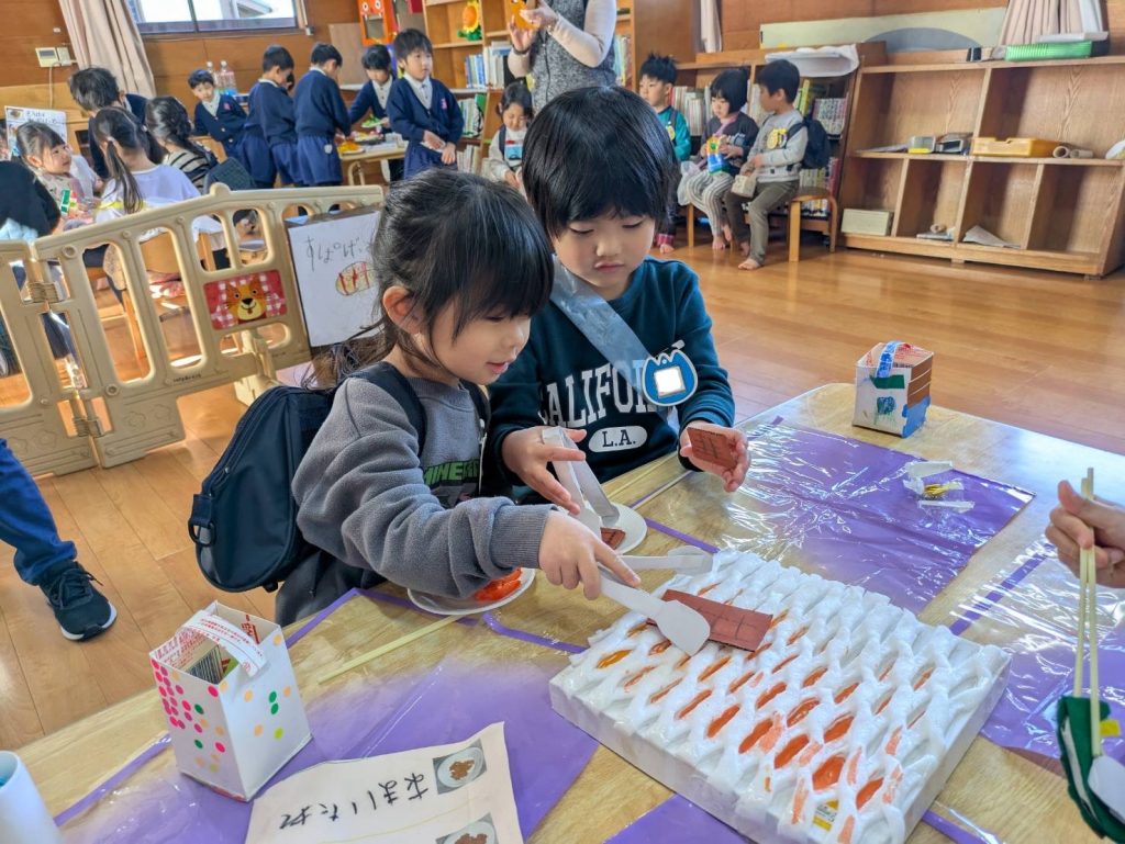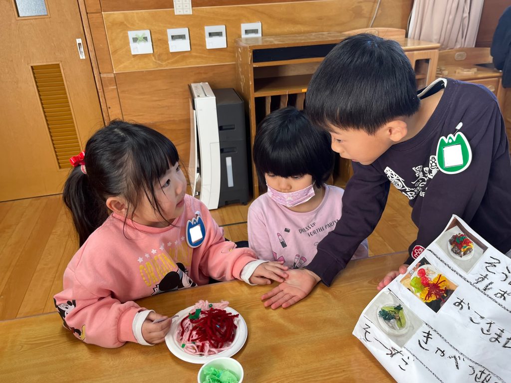 年長さんが1月から「ごはん屋さん」を作り、遊びを展開させて行きました。「何屋さんにする?」「メニューはどんなのがいいかな」と、子どもたちで話し合って、“スパゲッティやさん”“やきにくレインボー”“デザートやさん”の3つのお店ができました。そら組(4歳児)さんやつき組(3歳児)さんを招待するために準備を進めていく中で、「私はお客さんを案内する人ね。」「僕はスパゲッティ作るよ」など、一人ひとり役割を決めて取り組む姿が見られました。お店やさん当日は「いらっしゃいませ!!」という元気な掛け声でお店やさんオープン!そら組さんとつき組さんがペアで一緒に食べにきてくれました。