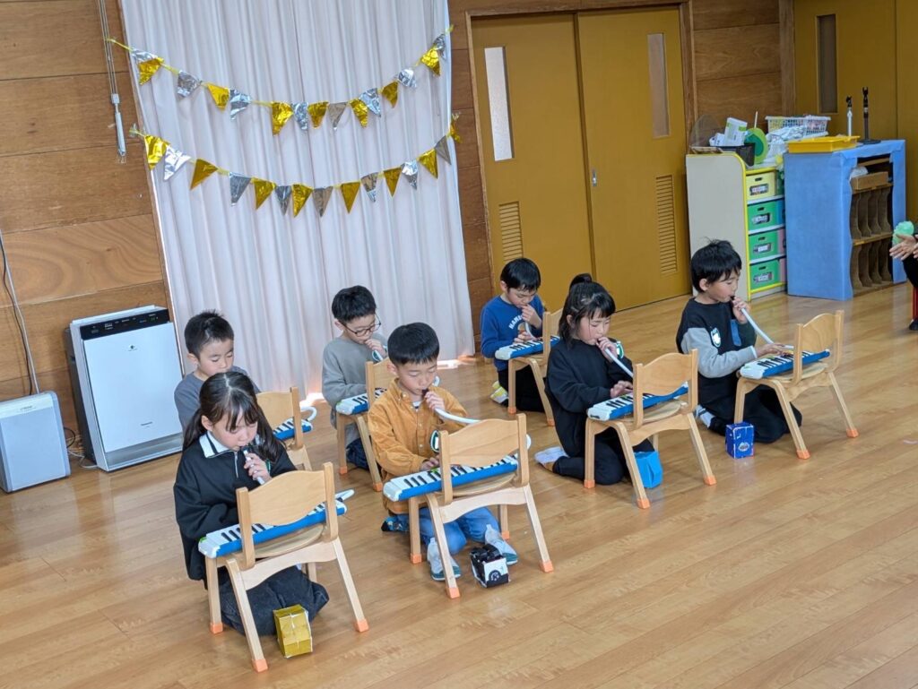 年長さんからも、「わになっておどろう」の曲をメロディオン演奏で贈りました。