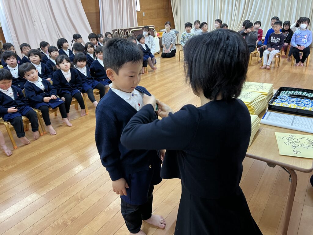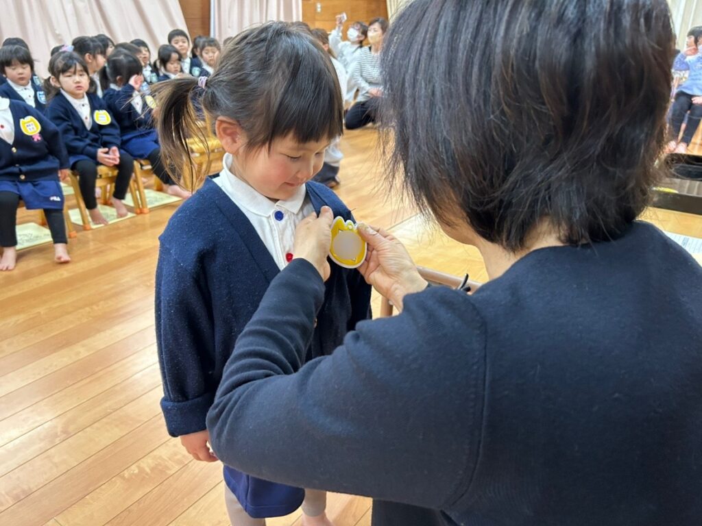 今日は心待ちにしていたジャンプの日。園長先生に新しいクラスの名札を胸に付けてもらいました。新にじ組さんは、一番上のお兄さん・お姉さんになるといううれしさと共に、緊張感をもって参加する姿が見られました。新そら組さんは、新しい名札を早くもらいたいとワクワクしながら名札を受け取る様子が見られました。新つき組さんは新しい制服を着てドキドキしながらも、一つ大きくなる喜びから笑顔が見られました。
