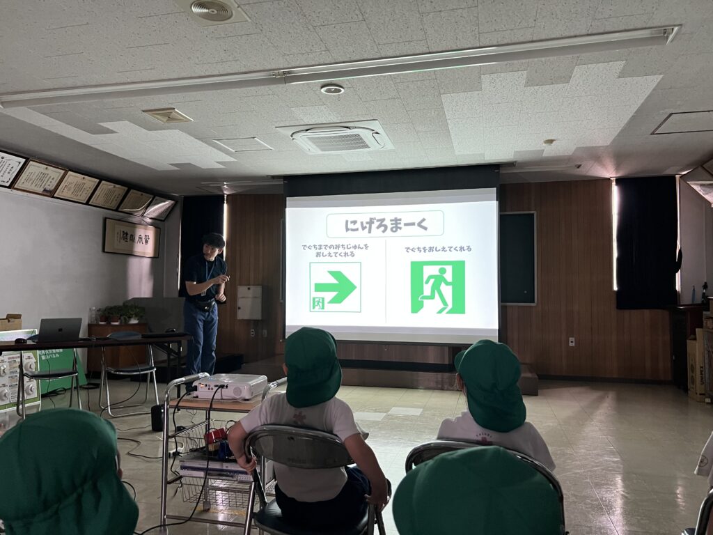 今日は消防署見学にいきました。お出かけ先で、もし火災や地震が起こった時、何を目印に避難すればいいのか?