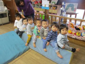 雨でも元気(0歳児) 2017 10/17 ニュース 雨の日は、お部屋でマット遊び。トンネルくぐりや、かくれんぼ、マットの滑り台で体を動かしています。一歩橋にお友達が座ると、みんなもまねてお座り。全員集合! 先日は大好きなアンパンマンに変身してパチリ☆アンパンマンの手遊びも上手です♪ ニュース URLをコピーしました! 芋掘り(4・5歳児) 遠足ごっこ♪(3歳児) コメント コメントする コメントをキャンセルコメント ※ 名前 ※ メール ※ サイト 次回のコメントで使用するためブラウザーに自分の名前、メールアドレス、サイトを保存する。 上に表示された文字を入力してください。 Δ