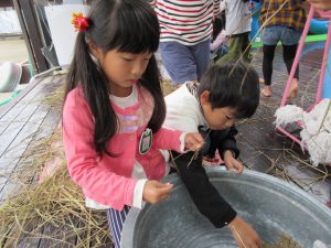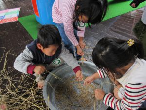 種から育てた稲の収穫!お米にする方法を知っていたお友達が、「稲からお米を外すんだよ。」とお手本を見せてくれました。ひとつひとつ丁寧に作業していると「お米にするのは大変なんだね。」との声がありました。「この中にお米が入ってるんだよね・・・?」と一粒ずつむいてみました。中から出てきたピカピカのお米に大興奮!