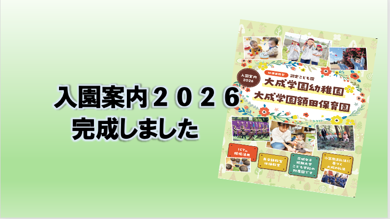 入園案内更新しました 2025 8/18 ニュース 入園案内2026を公開しました! ぜひ ご覧ください ☟こちらからダウンロード可能です https://www.taisei.ac.jp/tgnn/wp-content/uploads/2025/08/3a63cc28a4df1b12e29ddb841623f22b.pdf 見学は随時受け付けています。連絡をお待ちしています。 ニュース URLをコピーしました! プールじまい 楽しかった水遊び(5歳児) コメント コメントする コメントをキャンセルコメント ※ 名前 ※ メール ※ サイト 次回のコメントで使用するためブラウザーに自分の名前、メールアドレス、サイトを保存する。 上に表示された文字を入力してください。 Δ