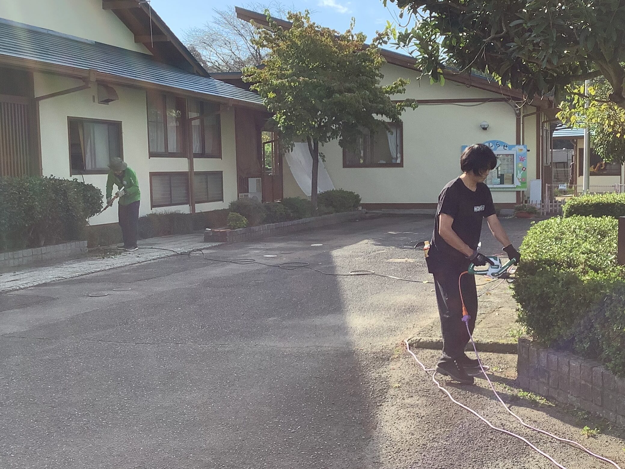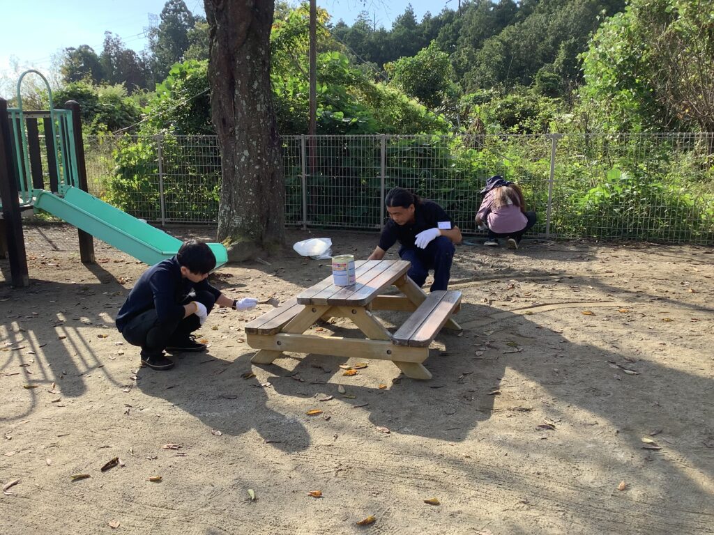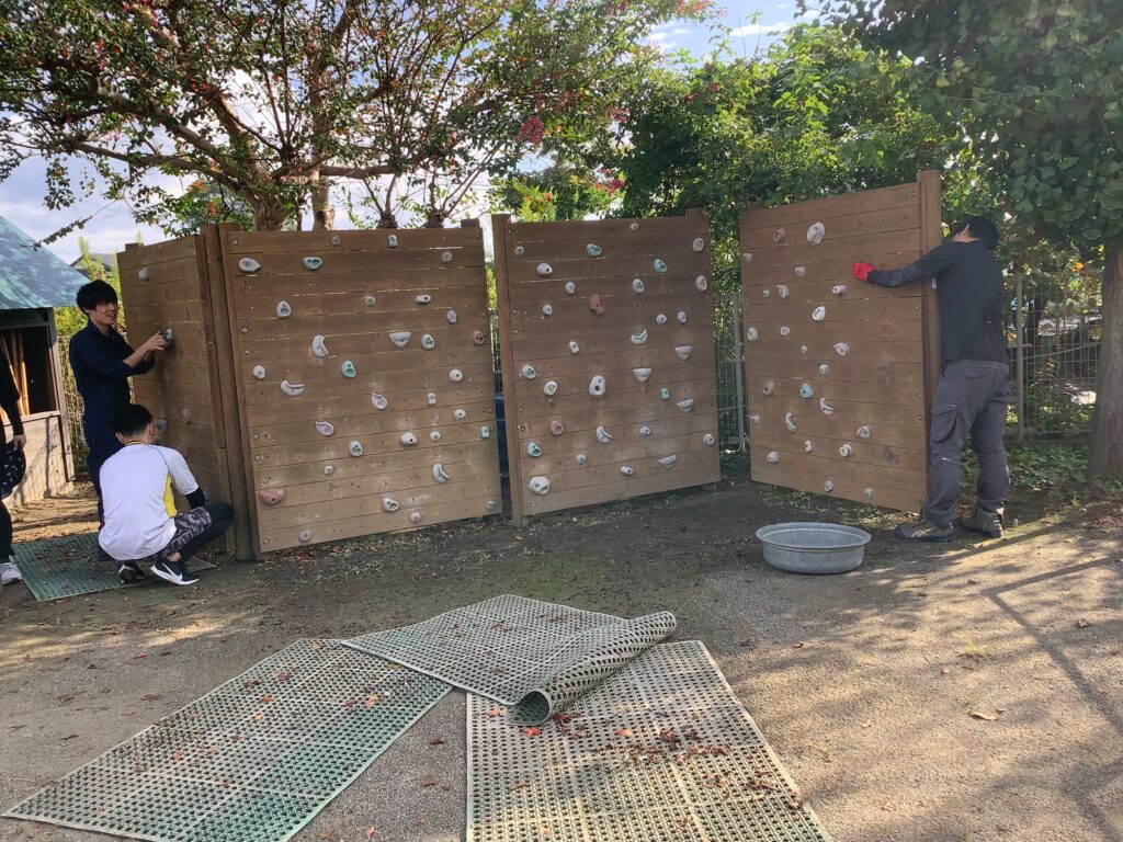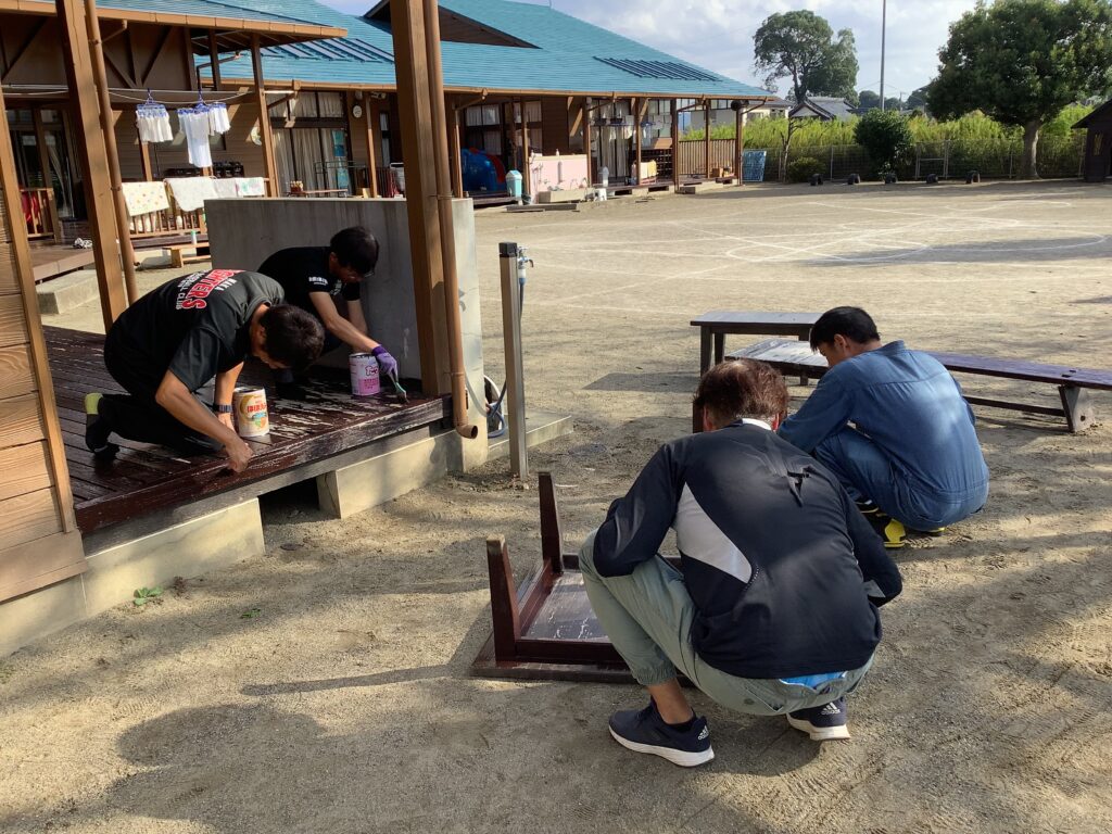 10月4日(土)に、つき組・そら組の保護者対象に奉仕作業と、第3回目のおやじの会を行いました。スポーツフェスティバルに向けて、園庭整備や植木の剪定、ボルダリングやテラスのペンキ塗りなどを分担しながらスムーズに進めていただきました。