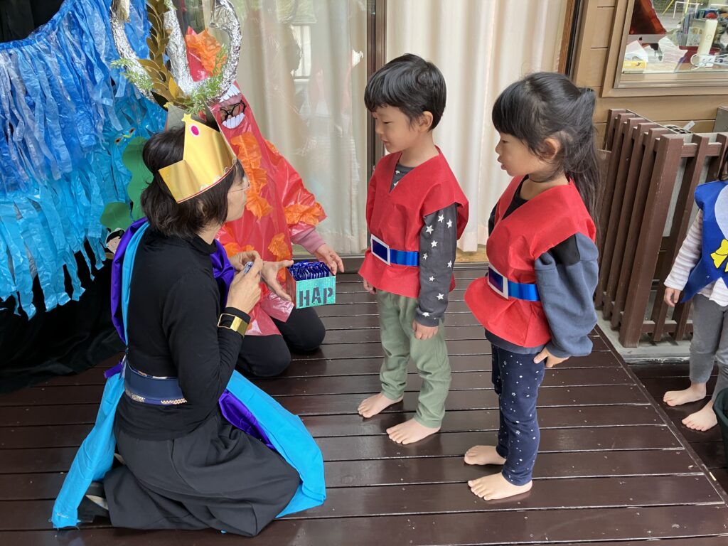 「トリック オア トリート お菓子をくれないとイタズラしちゃうぞ!」と言って、園長先生からお菓子をもらい大喜びの子どもたちでした。