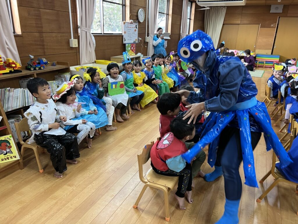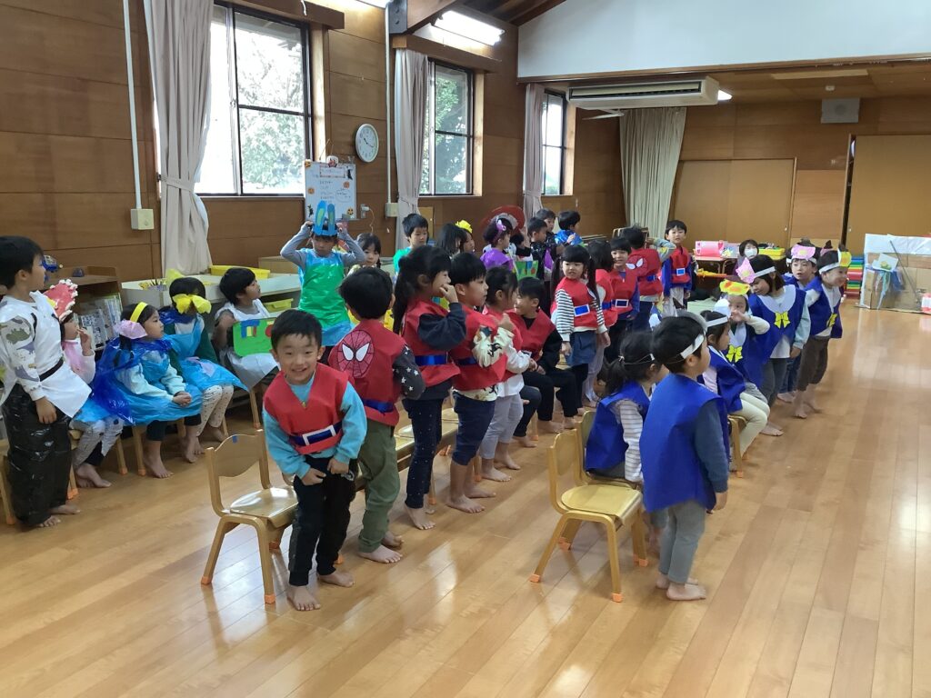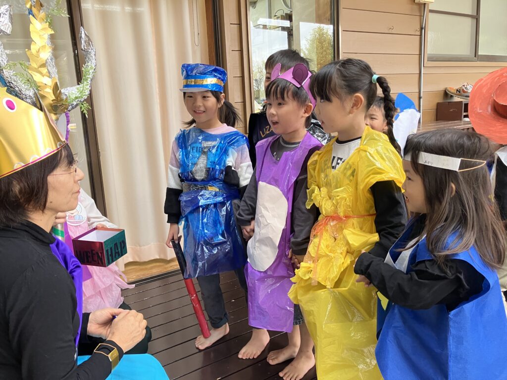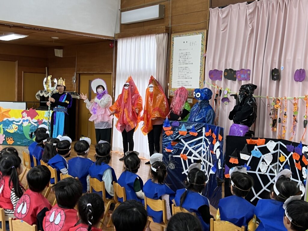 ペープサートを見たり、クイズをしたりしてハロウィンについて知ることができました。続いて、リトルマーメイドのキャラクターに扮 (ふん)して先生たちが登場すると、「〇〇先生だ!」と大盛り上がり。