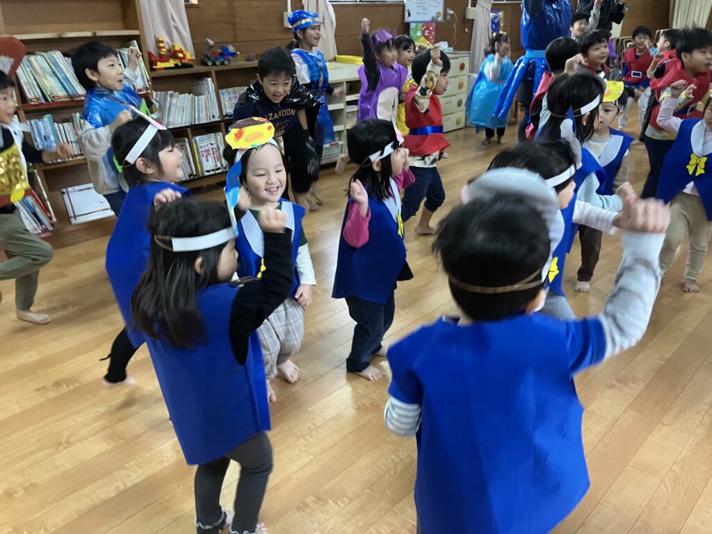 年長さんは自分で作ったトイストーリーのキャラクターの衣装、そら組さんは海賊、つき組さんはペンギンの衣装を着てハロウィンパーティーに参加しました。