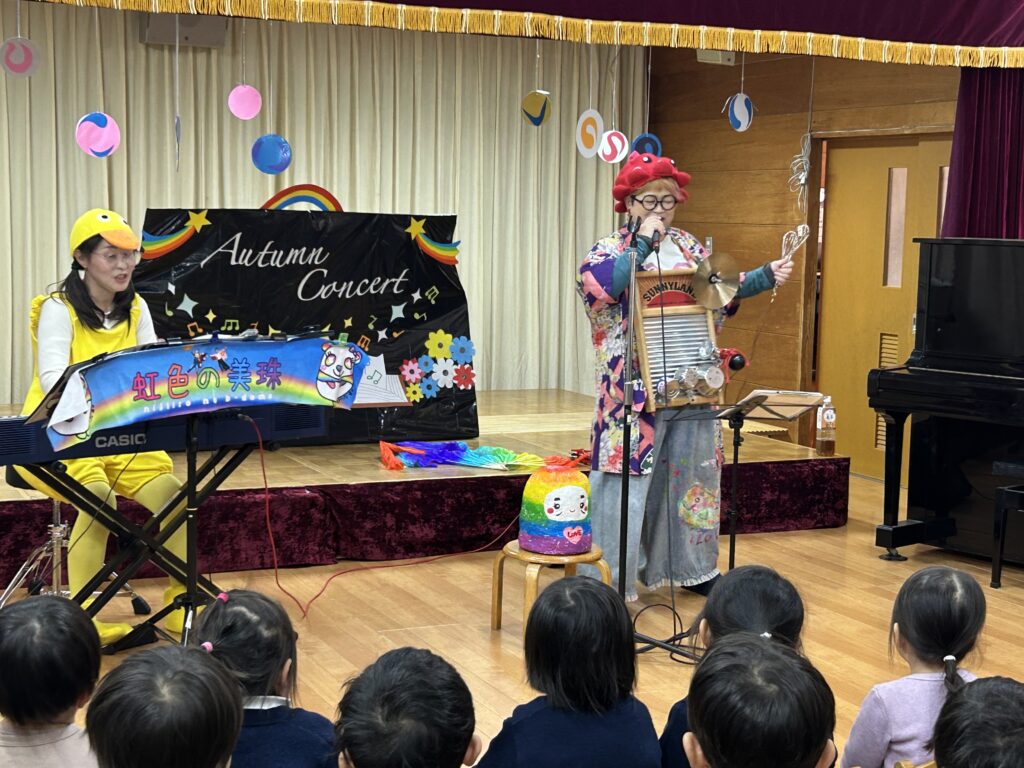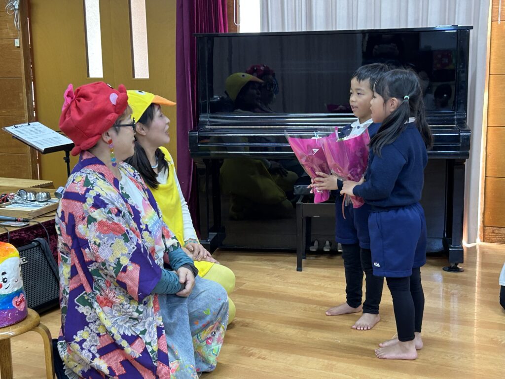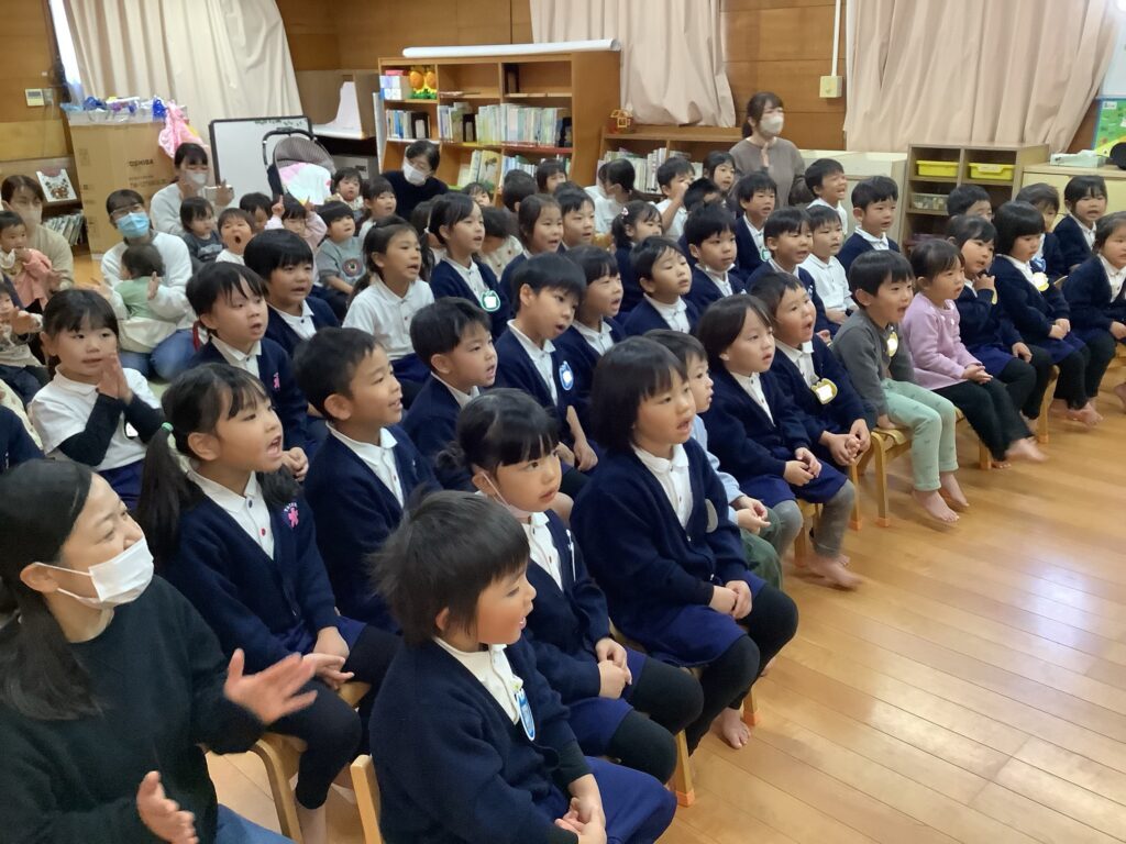 常に笑顔で子どもたちと向き合う虹色美珠(にじいろび-だま)さんと心を通わせ、大きな声を響かせ笑顔で歌う姿が見られました。「ビ-玉ドッキュン」オリジナルソングでは、園全体で「ドッキュン」の言葉と手振りを繰り返し一体感がうまれました
