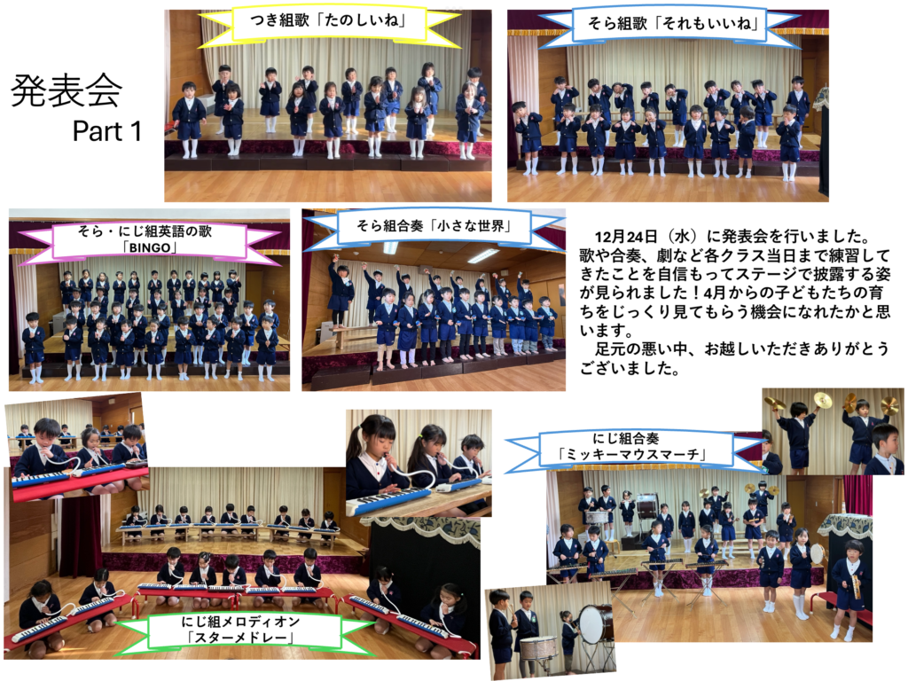 発表会(3.4.5歳児) 2025 12/26 ニュース ニュース URLをコピーしました! 親子ひろば「ぬかっぽ」身体表現(茨城女子短期大学ゼミ) クリスマス会 コメント コメントする コメントをキャンセルコメント ※ 名前 ※ メール ※ サイト 次回のコメントで使用するためブラウザーに自分の名前、メールアドレス、サイトを保存する。 上に表示された文字を入力してください。 Δ