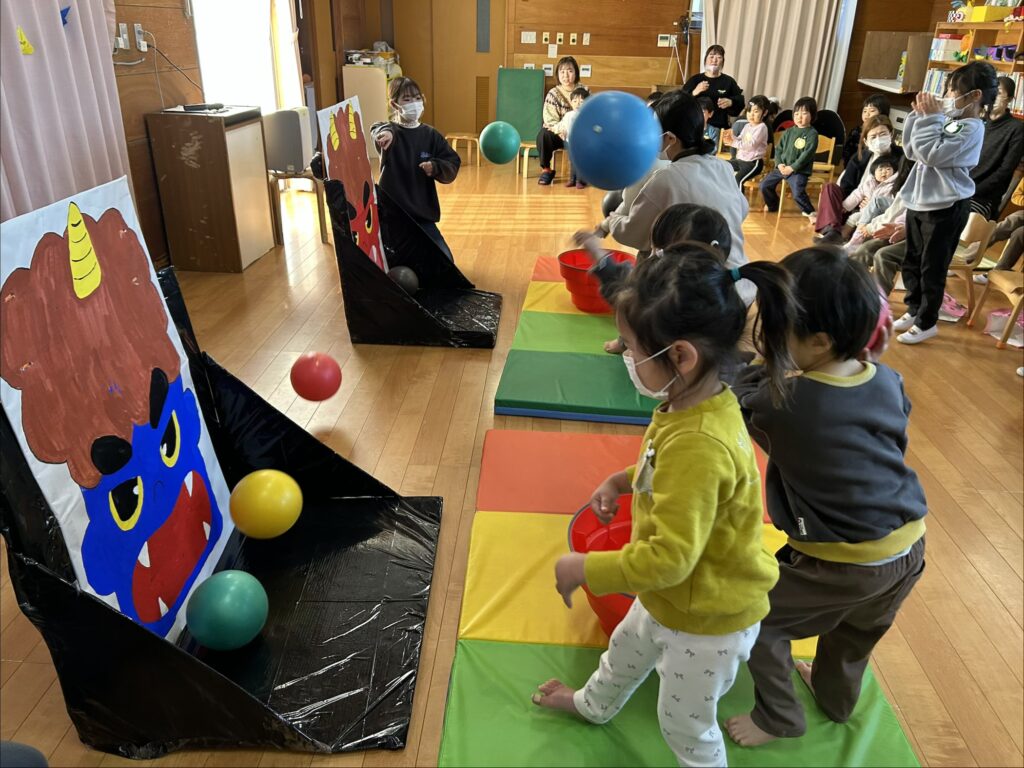 3日の豆まき会では、節分の由来の紙芝居を見た後に、鬼退治ゲームを行いました。赤鬼・青鬼の顔に向かって「おには〜そと!」と言いながら新聞紙のボールを投げ、ゲームを楽しみました。