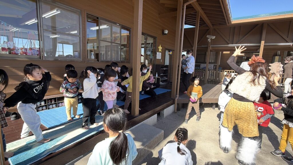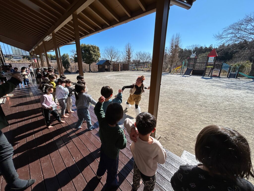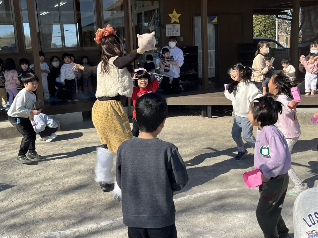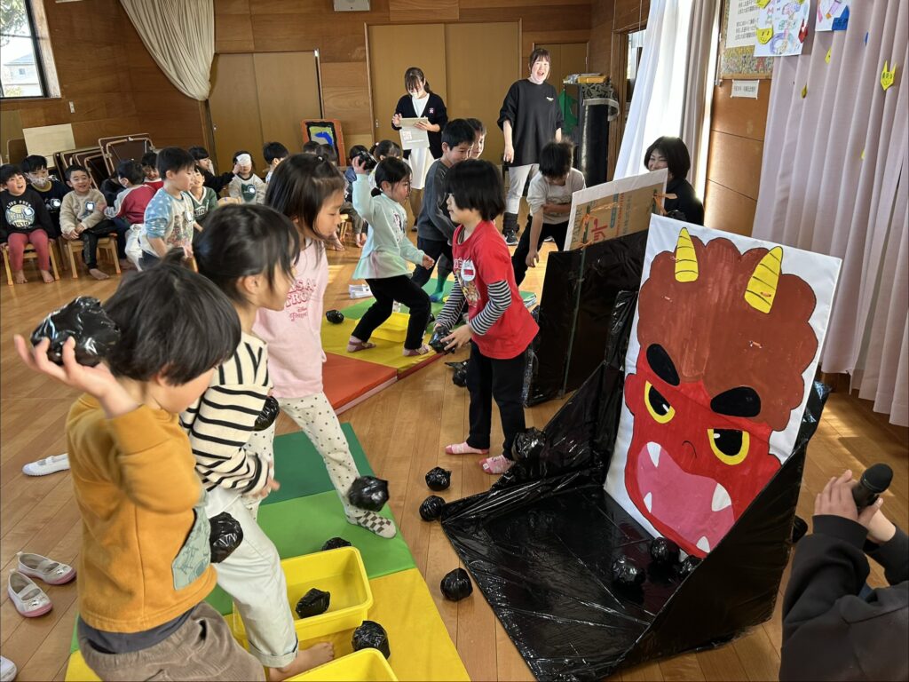 園庭に鬼が登場すると、「鬼がきた〜!」「やっつけなきゃ!」と驚きながらも年長さん・そらさん(4歳)・つきさん(3歳)で力を合わせて「おには〜そと!ふくは〜うち!」と豆をまく子どもたち。ほしさん(1歳、2歳)・ゆめさん(0歳)も応援で参加し、無事に鬼を退治することができました!
