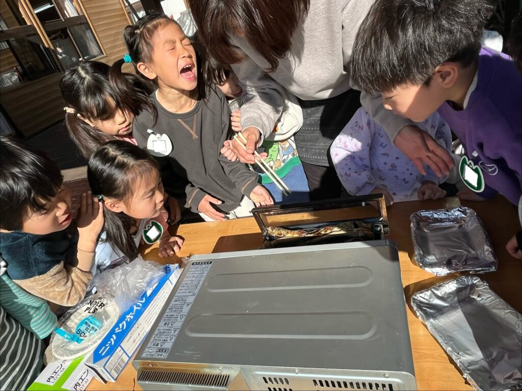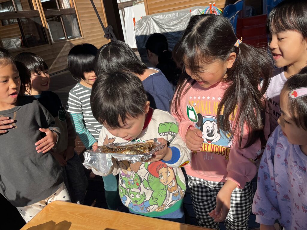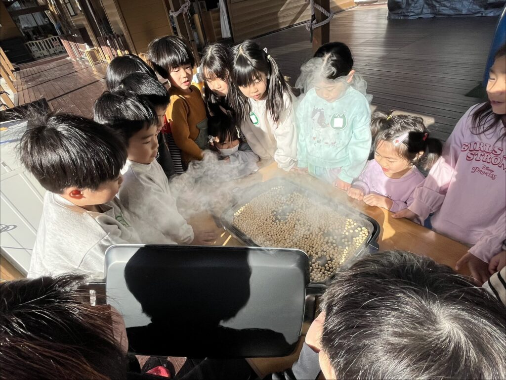 年長さんは、2日に【やいかがし】を作りました。少しずつイワシが焼けてくると、「すごいくさい!」と驚く声や「おいしそう!」と言う声もありました。また、3日には大豆を煎っていくと、「ポップコーンみたい!」「良い匂い!」などと匂いを感じながら楽しむ姿が見られました。