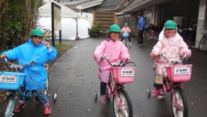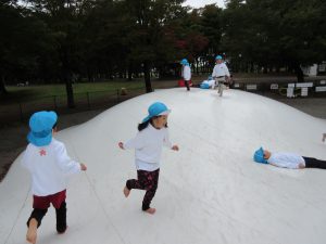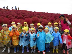 小雨の中スタートした遠足!到着と同時に雨が止み、5歳児はサイクリング!4歳児は徒歩で見晴らしの丘までコキアを見に行き、たまごの森で体をたくさん動かしてきました。3歳児はトレインに乗って公園を一周し見晴らしの丘で途中下車!秋を見つけられた遠足になりました。