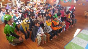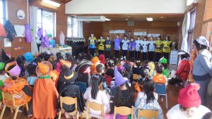 思い思いの仮装をした子どもたち。朝からの興奮を抑えてハロウィンの由来のお話を聞きました。茨城女子短期大学の学生の皆さんが、歌や手遊びをたくさん教えてくれて楽しい時間を過ごしました。