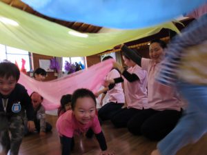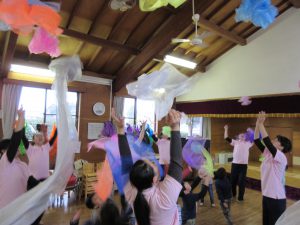 茨城女子短期大学の学生のみなさんと一緒に身体表現カリキュラムに参加しました。今回は色の表現遊び。赤・黄色・青それぞれの色と混ざり合った色を学生がダンスで表現したものを見て「色が混ざっていた。」「黒い色を混ぜると暗い感じだね。」と思い思いに感じることができました。子どもたちが好きな「虹の向こうに」の曲に合わせ表現ダンスを踊り楽しみました。