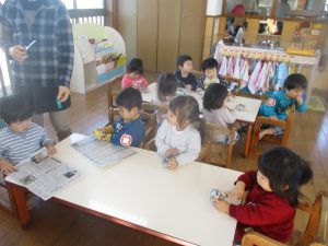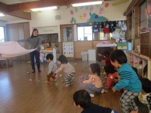 新聞紙をギュッギュッと丸めボールを作りました。自分たちで作ったボールが床一面に散らばると「うわ〜!!」「すごーい!!」と大興奮!!ボールを両手いっぱいに抱え落とさないようにシートに運び、床いっぱいに転がるボールがなくなると「もう一回!」・・・・繰り返し遊び大喜びでした。