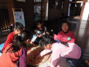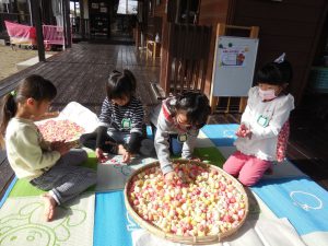 先日のもちつき会にて、祖父母の方と一緒に作った繭玉。あられにしようと干していましたが、程よく乾燥してきたので、年長さんが小さく割ってみました。ひび割れた繭玉を探したり、手のひらでグッと押してみたりと工夫しながら取り組んでいました。「早く、あられ食べたいな〜」の声が聞かれています。