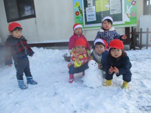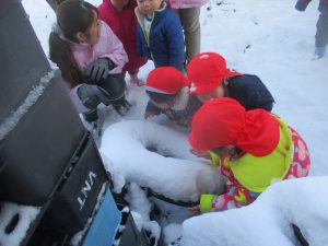 長靴を履いて外に出ると「うわ〜!!」「すごーい!!」と目をキラキラさせる子どもたち!!雪に触ると「冷たい!」「ふわふわ〜」と感触を楽しんでいました。タイヤに積もった雪を見て「ドーナツだ!!」と大喜び!!「手はお膝、いただきます!」とあいさつをして食べるまねをしていました(笑)