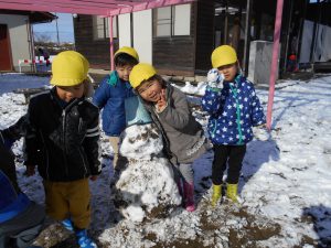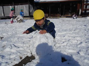 園庭一面が真っ白な雪の世界に大興奮!!始めは「寒い」「冷たい!」と雪に触れるのも拒んでいましたが、徐々に慣れてくると遊び方も大胆になりました。年長さんが雪だるま作りをしている姿を見ると、「作りた〜い!」と皆で力を合わせて大きな雪だるまを完成することが出来ました。