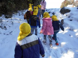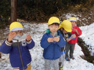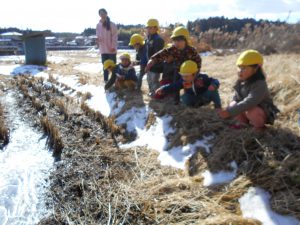 お散歩へ出掛けると先日降った雪がまだ残っていました。喜んで駆け寄り雪の上にのると「クッキーみたいだね」とサクサクなる音の感触を足で楽しみました。そして、田んぼまで歩いていくと・・・「あっ氷だ!」「前、カエルが泳いでたよね」と春の頃とは違うことに気付き、冬の自然を沢山見つけてきました。