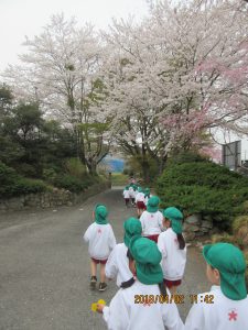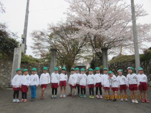 にじ組(年長児)になって初めての散歩。近くの阿弥陀寺へ桜を見に行きました。立派な枝垂れ桜は葉桜になっていましたが、ソメイヨシノは満開でした。「桜きれいだね。」風で花びらが散る様子を「桜の雪が降っているみたいだね。」と両手を広げて見入ってました。進級して初めての散歩を満喫しました。