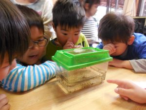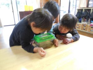 園長先生からもらった卵!!はじめは「おまめだよ」と言っていた子どもたち。日に日に見ていくうちに…「大きくなったから卵じゃない?でもなんの卵かな~?」なんて声もあがっています。はたして、この卵から何が誕生するのか??はたまたしないのか??わくわくして見ているところです。