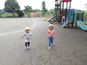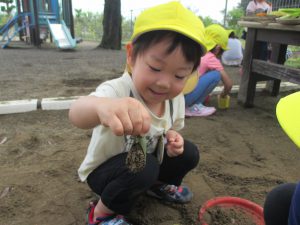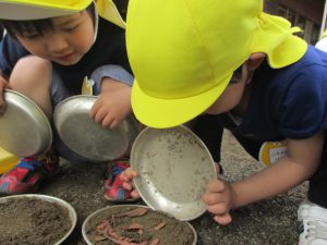朝の体操の後にみんなで集めている葉っぱや木の実。野菜などの食べ物に見立てて、砂場での遊びに使っています。みんなで分け合って少しづつ使う姿も出てきています。「ビーフシチューが出来たよ!!」