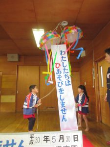 那珂消防署の方から火事や火の怖さについてお話を聞きました。また、火事や火遊びについてのDVDを観ると「怖いっ!!」「ダメだよ!!」と言ったり目を覆ったりする姿が見られ、火の危険性、怖さを実感しました。みんなで『私たちは火遊びをしません』と誓い、風船を飛ばしました。