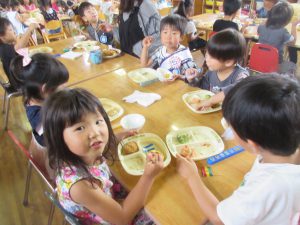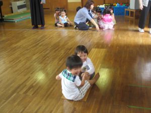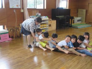 今年度の初めてのパーティーでつき組さんは初めての参加で朝からウキウキの様子。3、4、5歳児みんなでゲームにも参加しました。二人組みになって船で競争ゲームでは、なんとつき組さんが勝利!!「次は絶対勝つぞ!!」と次の大きなカブ抜きゲームはクラスのお友達が一致団結して先生と対決!見事、にじ組さんが勝利しました。笑顔のたくさん見られたパーティーでした。