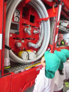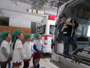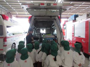 消防署に行き署内を見学しました。消防車を見たり、救急車の中の様子や消防車の道具に触れる体験もしました。消防士の着替える部屋や出動する様子も見学できました。終始、目をキラキラと輝かせ消防士さんの話を聞く年長さん「大きくなったら消防士になる!!」という子も…。