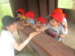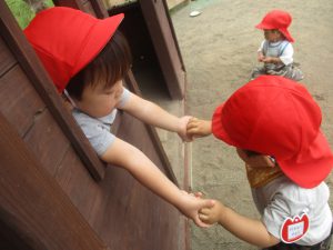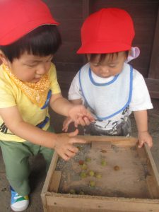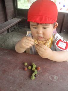 靴を履き、戸外に出ると、真っ先に大好きなログハウスへ向かいます。先日、おやじの会でリニューアルしていただいたことで遊びも広がり、ほし組1歳クラスにとってますます心地よい空間となっています。落ちていたヤマモモの実を集め、一人がカウンターに集めると二人、三人と並べ始めました。又、『どうぞ』『同じだね』とちょっとしたやりとりも見られています。