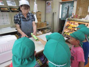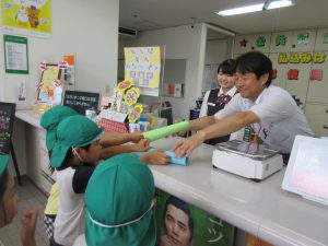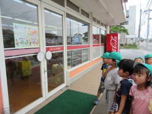 夏祭りのポスターを配りに郵便局・お菓子屋さん・くめさんの3ヶ所に行き、自分たちで「お祭りがあるのでポスターを貼ってください」としっかりと伝えることができました。早速、お店の人が入口に貼ってくれ「やった!飾ってくれたよ!!」「ここだったらいっぱい見てくれるね!」と、飾ってくれたポスターを眺めていました!