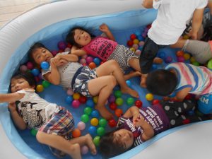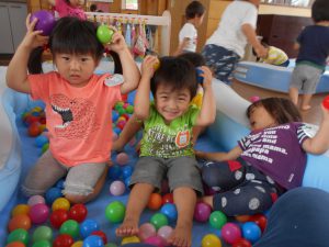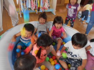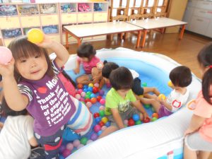 プールが始まる前にボールプール遊びをしました。ボールを見るなり「わぁ〜」と言ってうれしそうにプールの中に入り、上に投げたり、寝転がったり、ミッキーに見立てて頭の上にボールをのせてみたりと大喜びでした!