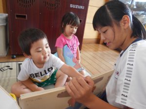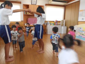 7月24日、25日の二日間、那珂二中のお姉さんが職場体験にきました。一緒にリトミックを行いお姉さんにトンネルを作ってもらい電車になって通ったりと体を動かしました。また、戸外の砂場で山作りをしたり、絵本を読んでもらったりと、たくさん遊んでもらいうれしそうでした!!
