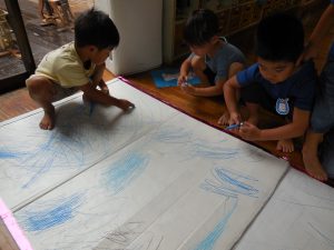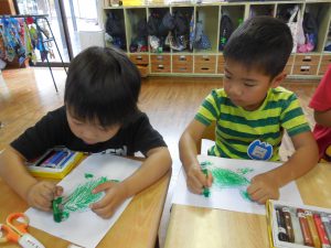 ”にじいろのさかな”の絵本を見て、にじ魚づくりがはじまり、きらきらうろこもしっかりつけました。そのあと「にじ魚は海にいるよ!」と海づくり…「海にはタコ、カメもいる」と図鑑を広げては海の生き物も描いていました。