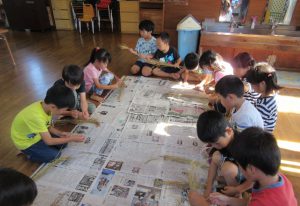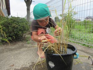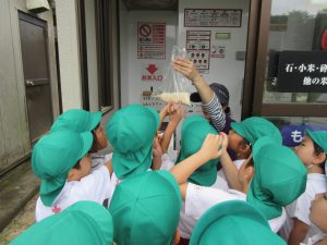 一人一人がバケツで育てた稲を収穫・脱穀しました。自分の手で脱穀をするのは初めてで「わらがチクチクするー」「お米を取るのって難しい・・!」と苦戦しながらも集中して取り組んでいました。脱穀し終わったお米を持って精米所へ・・・もみが精米されていくお米を見て「うわ~白くなった!」と目をキラキラさせ、興味津々でした。精米したお米で「おにぎりを作りたい!」「早く食べたい!」と次への楽しみにつながっています。