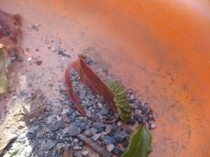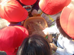 戸外で遊んでいるとあおむしを発見!!あおむしを囲んでじっと見ていると、大好きな絵本”はらぺこあおむし”の歌を口ずさみ出す・・・。青虫さん『おなかすいてるよ』『ご飯あげよう』と近くに落ちてた葉や枝など、そっと置き『あ、葉っぱ食べてる』と絵本の世界に入り込み共感する姿がたくさん見られました。