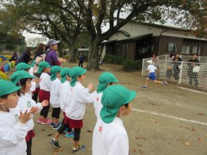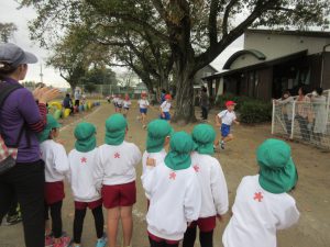 額田小学校の持久走大会を見学しに行ってきました。去年の年長さんや知っているお兄さんお姉さんたちを見つけると手を振ったり「がんばれ!!」と応援したり・・・また、一生懸命走っている姿に「かっこいい!」「ぼくたちも走りたい!」と憧れや期待を膨らませていました。